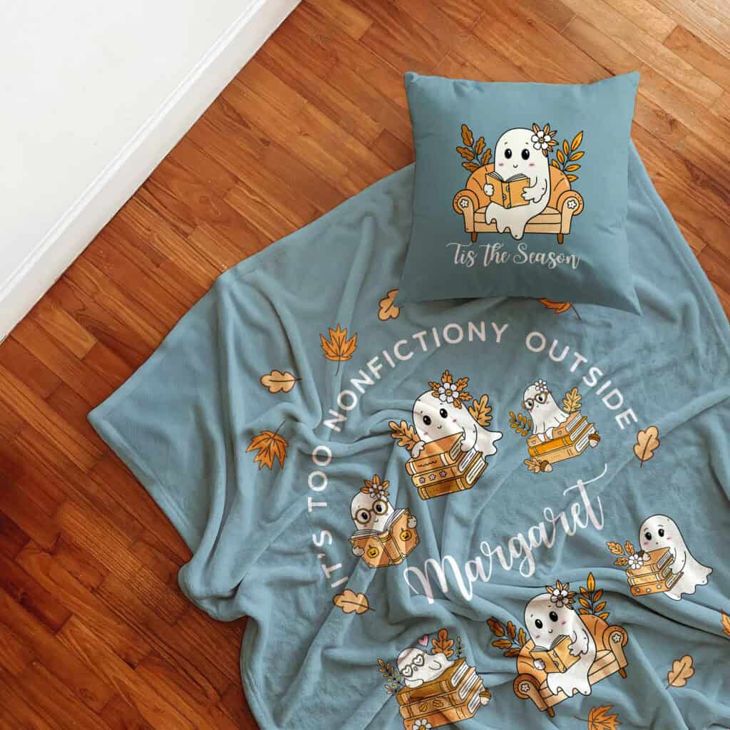 Escape into your own cozy story with this personalized ghost blanket, available in lightweight velveteen or super soft sherpa. Custom-made with your name and the cutest little ghosts, this blanket is perfect for readers who love cozy corners, playful spirits, and the kind of comfort that sparks both imagination and delight. Pair it with a matching throw pillow for the ultimate cozy escape. BIPOC woman-owned business