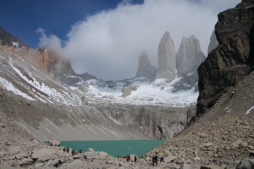 Patagonia’s O Circuit spans roughly 130 km, with its highest passes reaching 1,200 meters near the Southern Patagonian Ice Field. This ice mass covers about 12,000 km², feeding glaciers visible from multiple trail sections. Even in summer, daytime temperatures average just 11°C, while snowstorms can strike unexpectedly. The John Gardner Pass frequently holds snow year-round due to strong winds and constant ice accumulation. Annual precipitation surpasses 4,000 mm, reinforcing permanent snowfields that define the trail’s dramatic, frozen skyline.
