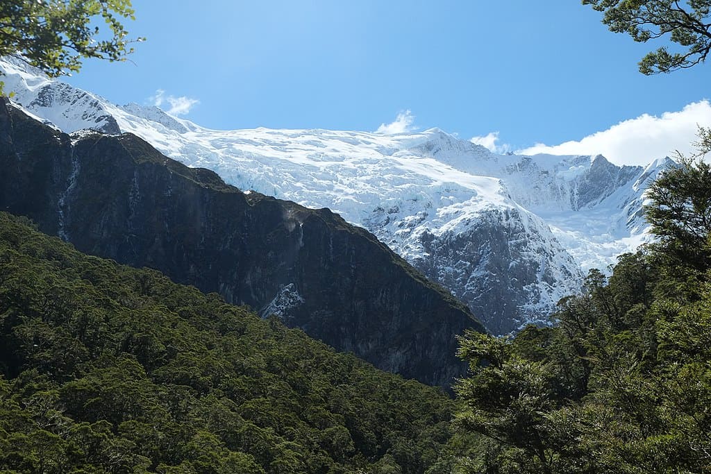 This 10 km return hike climbs to around 1,050 meters, ending beneath the hanging Rob Roy Glacier. Fed by peaks over 2,600 meters high, the glacier retains snow and ice in every season. Average summer temperatures range from 10–14°C, yet avalanches of snow are common year-round from the surrounding walls. The valley receives over 3 meters of snowfall annually at higher elevations. Despite moderate elevation gain of 400 meters, hikers consistently encounter snow-covered slopes, glacial ice, and frozen waterfalls even outside winter.