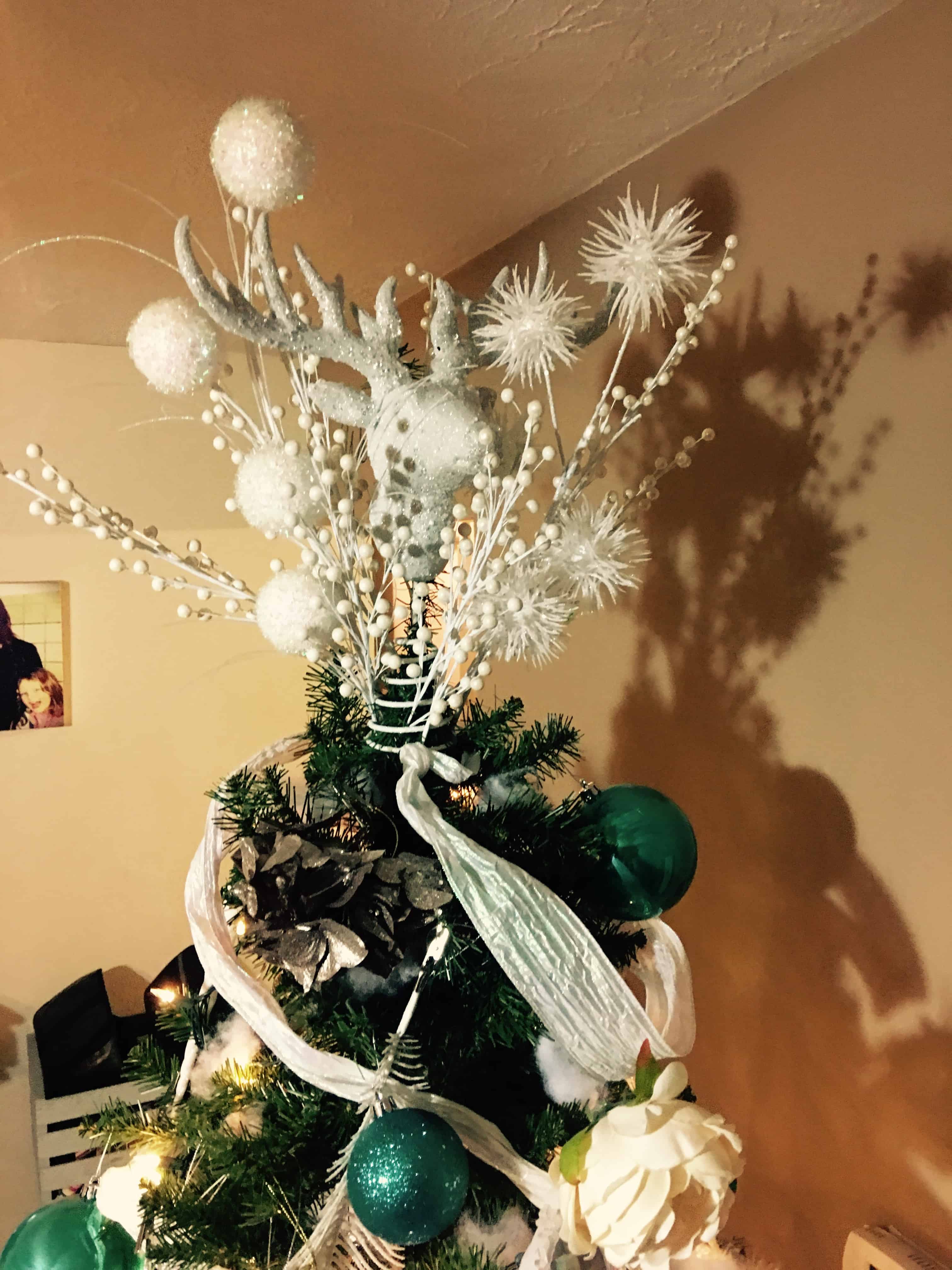 Our glittery deer tree topper + a bunch of other decorations I added to it!