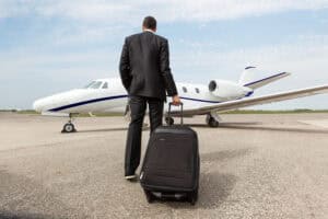 Rear view of businessman with luggage walking towards corporate jet