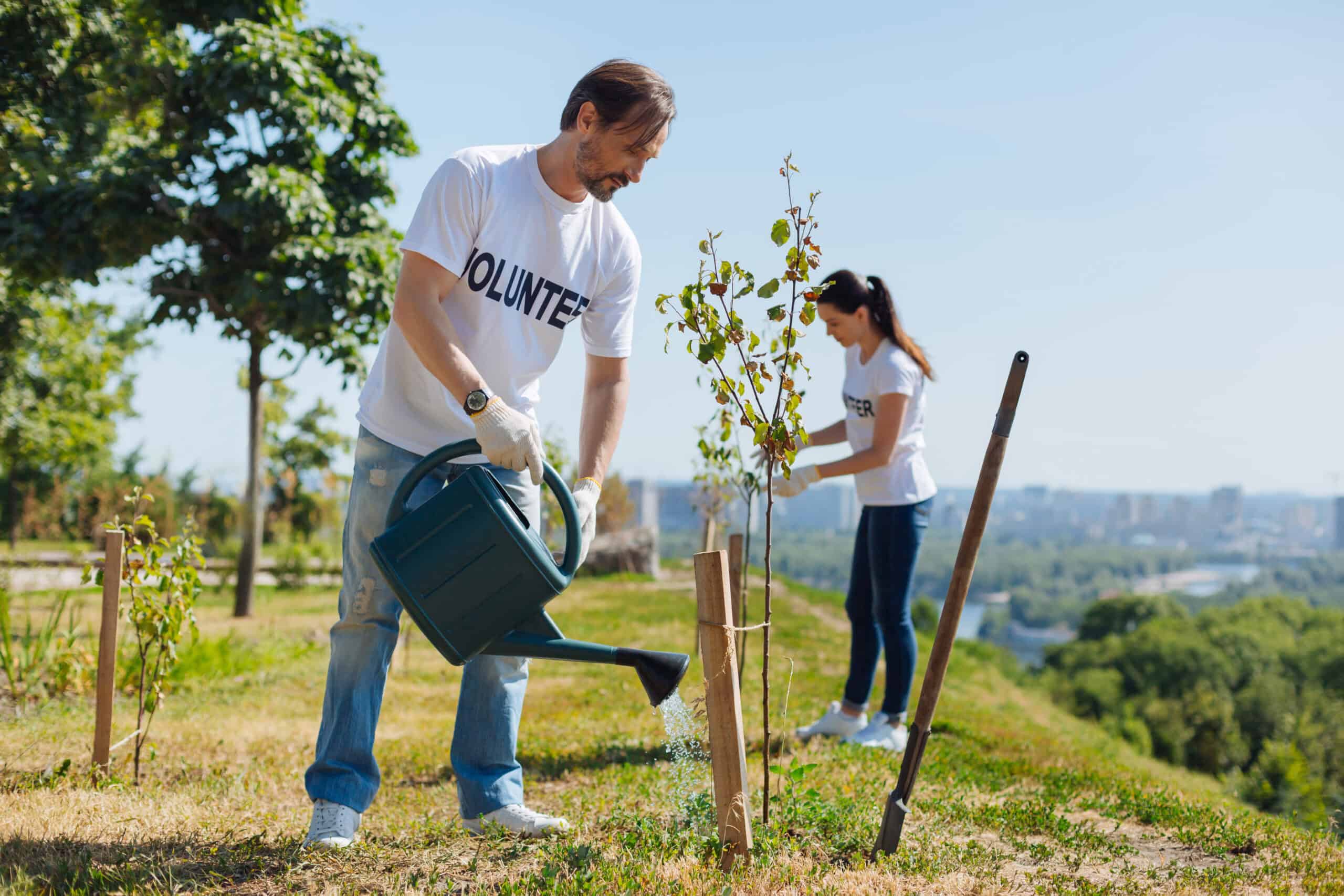 Diligent clever man nurturing new trees with moist
