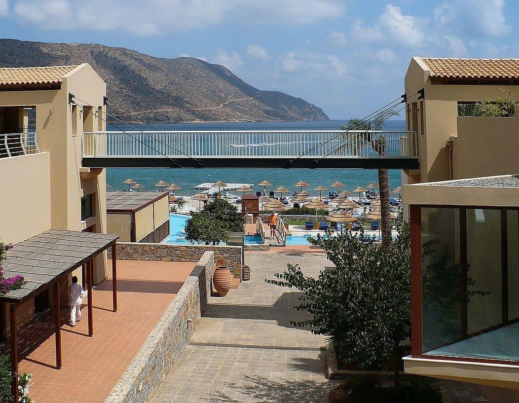 Facing historic Spinalonga Island, Blue Palace stretches across 143 acres along Mirabello Bay. The property includes 202 rooms, suites, and villas, many with private infinity pools overlooking the sea. Entry-level rooms measure about 430 square feet. Five restaurants and a 2,000-square-meter spa create a full-service experience. A private pebble beach extends 650 feet below the terraces. Peak-season prices average $600 per night, blending Cretan character with contemporary comfort.