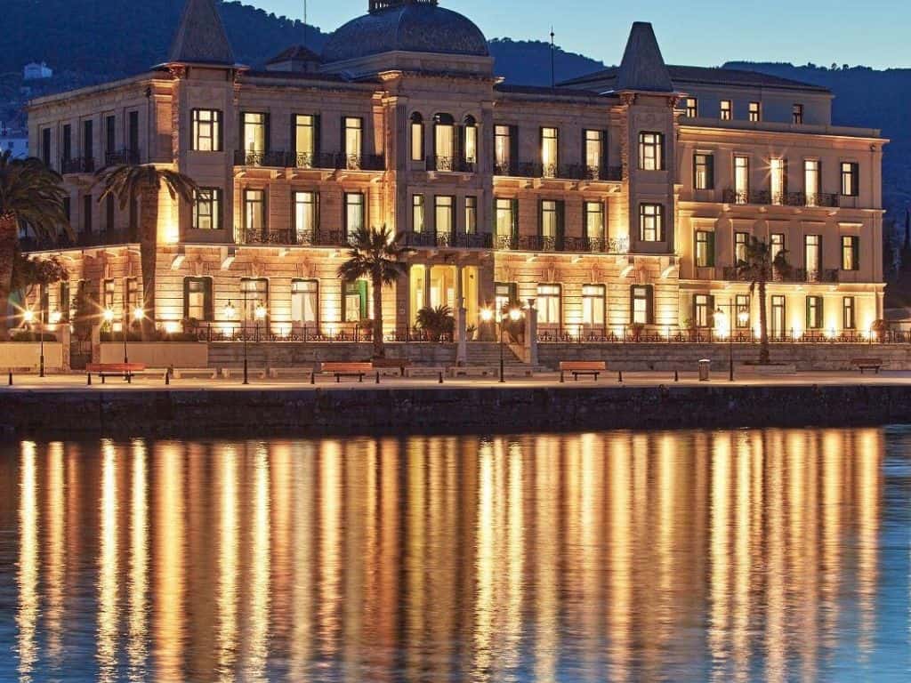 Opened in 1914, Poseidonion Grand Hotel stands prominently on Spetses’ Dapia port. The property includes 52 rooms divided between historic and newer wings, with spaces averaging 270 square feet in the original building. Two freshwater pools and a 1,500-square-meter spa complement its Belle Époque style. High-season rates begin near $455 per night. Its harborfront façade remains one of Greece’s most iconic architectural landmarks.